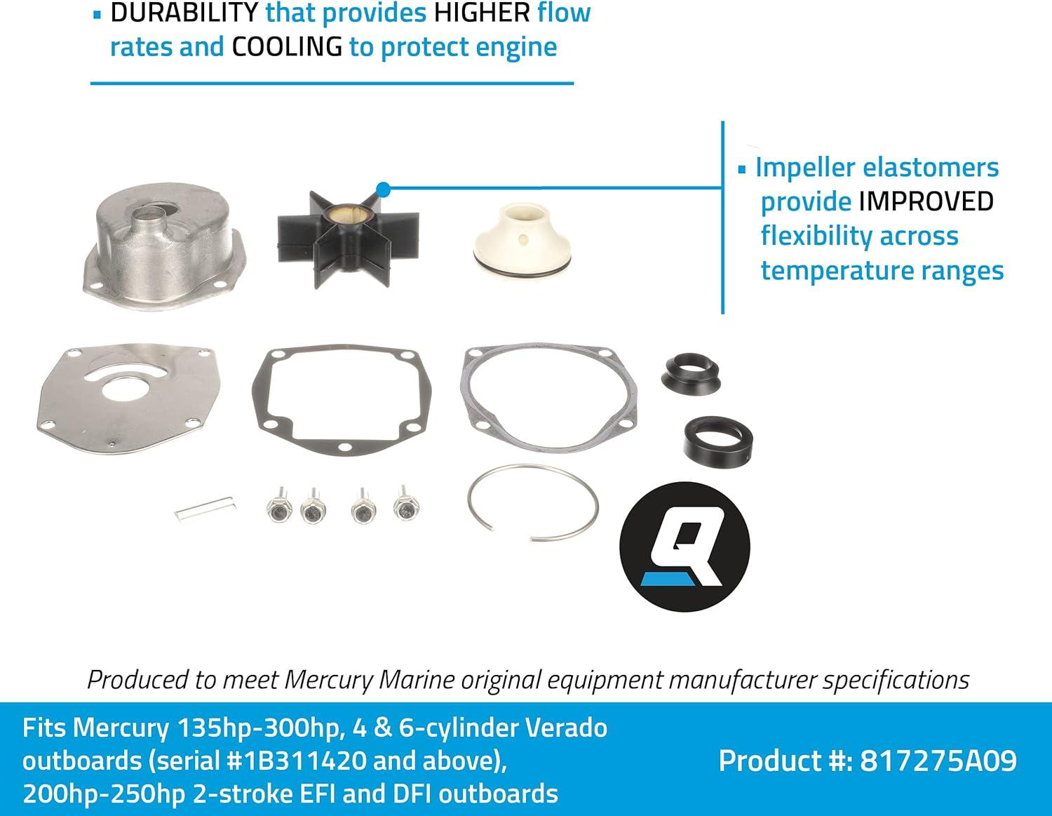 Water pump repair kit 812275A09 is for 135 through 200hp EFI outboards, 135 through 300hp Verado outboards and 200 through 300hp ProXS outboards. The kit includes water impeller, upper and lower housings, oil carrier, retaining ring, plate, gaskets, seals and o-rings. See your owner's manual or service manual for specific applications and replacement instructions.The Quicksilver brand is the leader in delivering uncompromising engine oils, parts and accessories to the marine industry for over 65 years. Quicksilver is the premier supplier of Mercury Marine original Equipment replacement engine parts, oils, and accessories, but also works to serve all original Equipment brands in the marine and powersports industries. It has earned a loyal following by providing the highest quality products that are tested through some of the most rigorous environments and testing procedures. No aftermarket company comes close to the level of research and design as Quicksilver; buying Quicksilver is buying performance, protection and peace of mind.