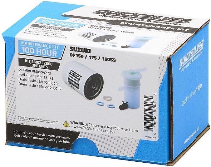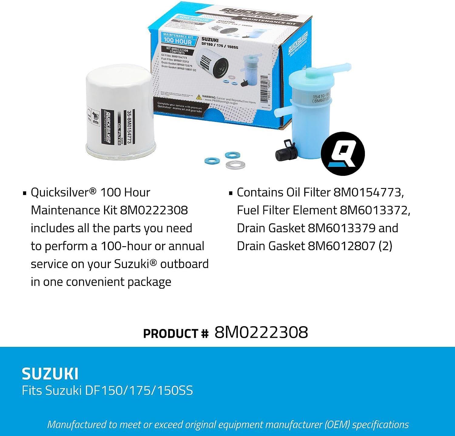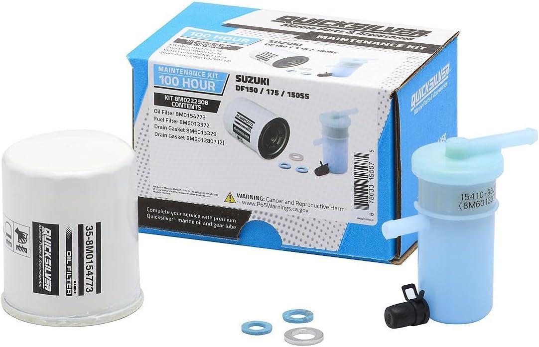 Quicksilver® 100 Hour Maintenance Kit 8M0222308 includes all the parts you need to perform a 100-hour or annual service on your Suzuki® outboard in one convenient package