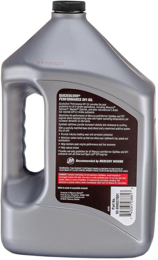 Direct Injection Engine Oil 858037Q01 is recommended for use in DFI Mercury, Mariner, OptiMax outboards and DFI 2-cycle engines.The Quicksilver brand is the leader in delivering uncompromising engine oils, parts and accessories to the marine industry for over 65 years. Quicksilver is the premier supplier of Mercury Marine Original Equipment replacement engine parts, oils, and accessories, but also works to serve all Original Equipment brands in the marine and powersports industries. It has earned a loyal following by providing the highest quality products that are tested through some of the most rigorous environments and testing procedures. No aftermarket company comes close to the level of research and design as Quicksilver; buying Quicksilver is buying performance, protection and peace of mind.