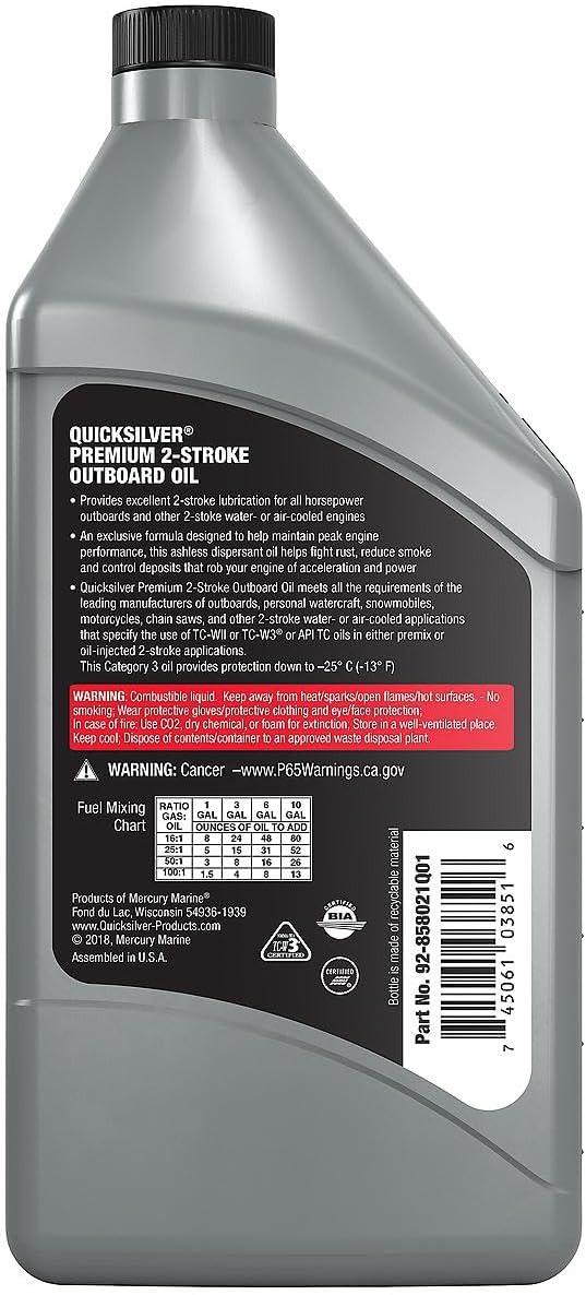 Quicksilver Premium TC-W3 2-cycle oil provides excellent lubrication for outboards, PWC’s, motorcycles, snowmobiles and small engines. The ashless dispercement oil fights rust deposits in the combustion chamber, intake and exhaust passages. This NMMA TC-W3 oil reduces exhaust smoke and controls deposits that can cause spark plug fouling or sticking rings. The Quicksilver brand is the leader in delivering uncompromising engine oils, parts and accessories to the marine industry for over 65 years. Quicksilver is the premier supplier of Mercury Marine Original Equipment replacement engine parts, oils, and accessories, but also works to serve all Original Equipment brands in the marine and powersports industries. It has earned a loyal following by providing the highest quality products that are tested through some of the most rigorous environments and testing procedures. No aftermarket company comes close to the level of research and design as Quicksilver; buying Quicksilver is buying performance, protection and peace of mind.